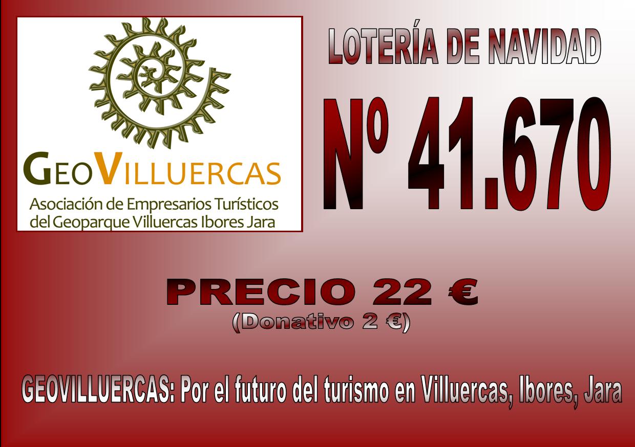 GeoVilluercas ya tiene la lotería de Navidad para este año, el número es 41.670 y el precio del décimo de 22 euros (2 euros de donativo para la asociación). Todos los socios que estéis interesados en venderla o todos los que queráis comprar y colaborar con nuestra asociación podéis poneros en contacto con Isabel Jorge Sanchez, del hostal Alba Taruta de Guadalupe.